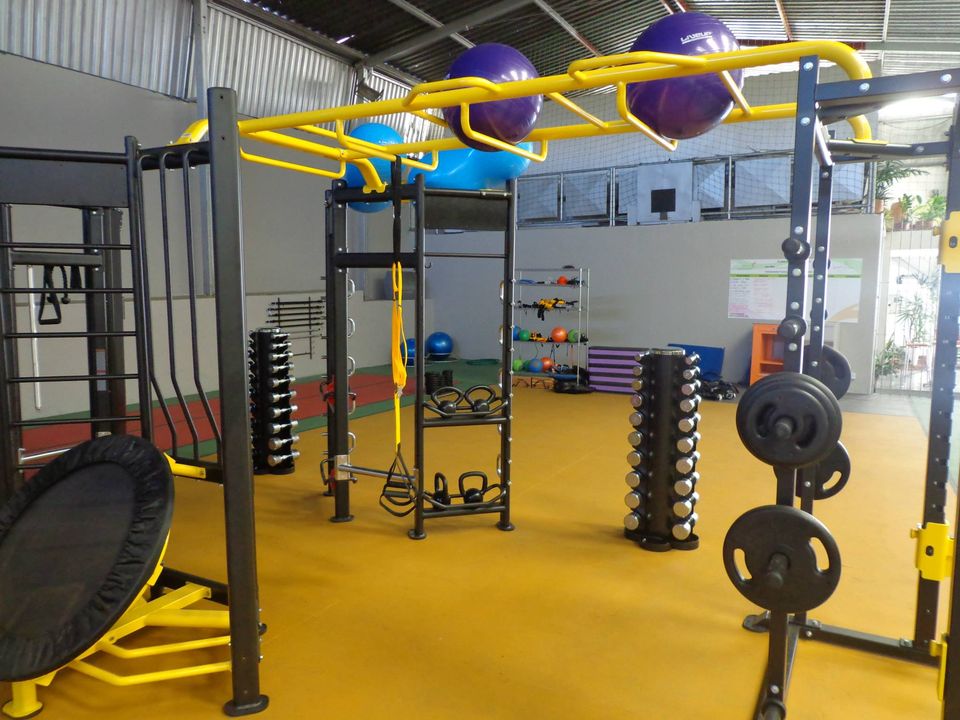 Temos o espaço das crianças com jogos e brinquedos, mas também temos treino funcional kids...