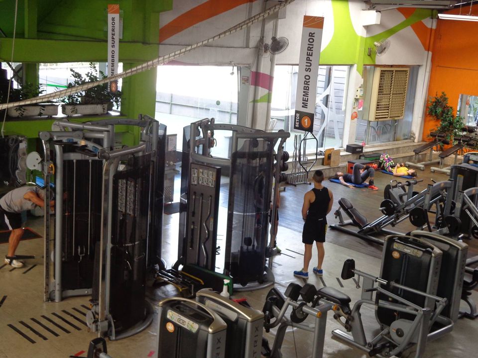 Nossa área de musculação, tem tantos metros e tais equipamentos, e circulação de ar constante por enormes janelas